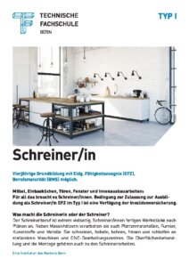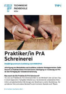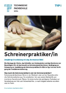Die Ausbildungen im Bereich Schreinerei sind für Jugendliche oder Erwachsene mit einer Beeinträchtigung möglich. Der Werkstattunterricht, die Berufsschule und üK (überbetriebliche Kurse) finden in kleinen Klassen mit rund sechs Lernenden an einem Standort statt. Die Berufsbildner/i und Berufsschullehrperson arbeiten eng mit Eltern, IV und weiteren involvierten Personen zusammen.
